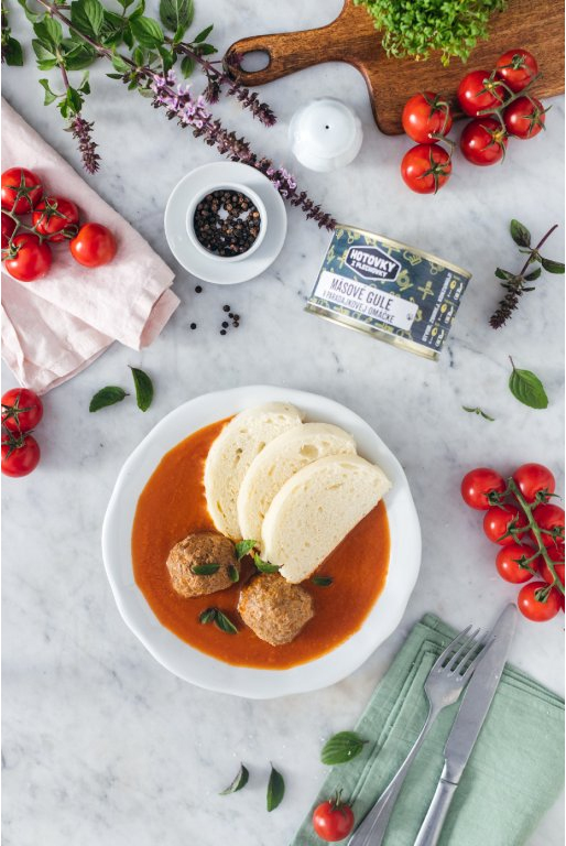 Zloženie: hovädzie a bravčové mäso, VAJCIA, STRÚHANKA (LEPOK), solamyl, mrkva, paštrnák, ZELER, rajčinové pyré, voda, repkový olej, PŠENIČNÁ MÚKA, sol, cukor, zmes korenia