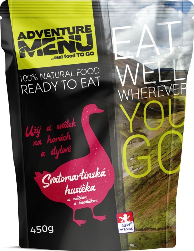 Uži si sviatok Sv. Martina vonku a v poriadnom štýle! Prinášame ti tradičnú a poctivú Svätomartinskú husičku s kapustou a knedľou, pripravenú od základu u nás v Podkrkonoší. Keďže každý chce vždy stehno, tak u nás vyhrávajú naozaj všetci. Základom je vykostené husacie stehno pečené na pare, doplnené o ručne robenú červenú kapustu a klátiky zo zemiakového cesta. Porcia 450g zaistí, že už potom nič nevyjdeš, preto odporúčame zvoliť adekvátnu trasu a miesto obeda.
