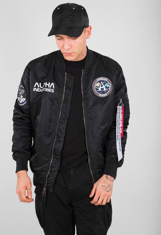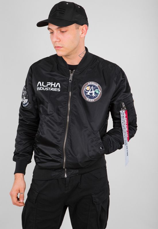 Obojstranná čierna bunda od značky Alpha Industries v bomber strihu. Odpudzuje vodu a je vetru odolná. Ľahká bunda vhodná aj na teplejšie počasie. Ako ochranu pred vetrom a pre pohodlné nosenie má bunda úpletové lemovanie na rukávoch a okolo pása. Dizajnovaná bola v spolupráci s NASA, a je venovaná k 50. výročiu misie Apollo 11. Preto má okrem tradičného štítku s logom Alpha Industries aj štítok s textom “Tu, muž z planéty Zem prvýkrát položil nohu na mesiac. Júl 1969 A.D. prichádzame v mieri pre celé ľudstvo.” Ďalej sú na bunde špeciálne nášivky venované tejto udalosti.