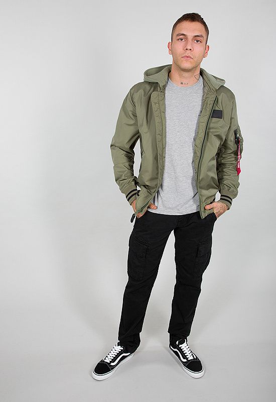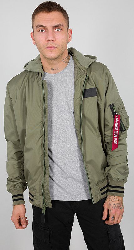 Zaujímavá ľahká bunda v bomber strihu s kontrastnými pásmi na úpletových častiach a zaujímavou potlačou na chrbte a kapucni. Bunda má okrem toho aj utility vrecko a nášivku Alpha Industries na hrudi, samozrejme nesmie chýbať ikonický štítok Remove before flight.