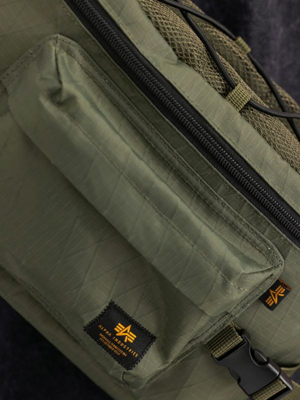 Pre ešte väčšie pohodlie je na vonkajšej strane ďalšie vrecko, do ktorého máš rýchly prístup k veciam, ktoré potrebuješ mať po ruke. Na prednom paneli je umiestnený aj tkaný Alpha label, decentne odkazujúci na ikonickú značku.