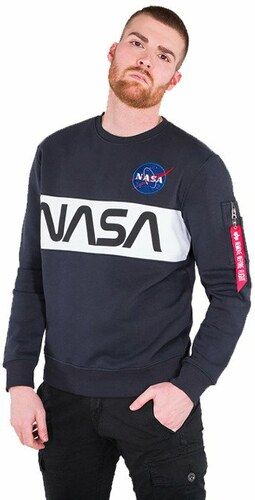 Modrá mikina s potlačou NASA od Alpha Industries, s nášivkou NASA a s vreckom na rukáve a ikonickým štítkom “remove before flight”.