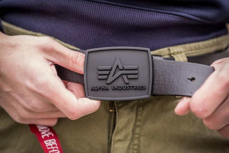 Kvalitný a štýlový opasok s vyrazeným logom Alpha Industries na plastovej pracke pracke.