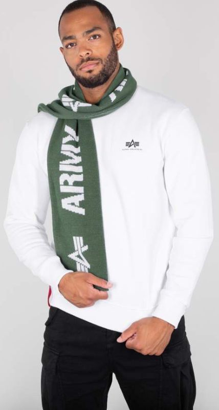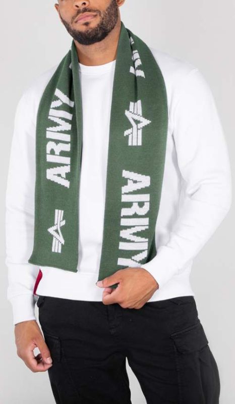 Zelený štýlový šál s nápisom ARMY a logom Alpha Industries.