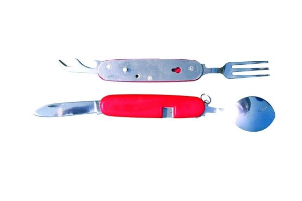 Kompaktná sada príborov obsahujúca nôž, vidličku, lyžicu, otvárač na konzervy a otvárač na flaše. Zložená sada má veľkosť 9 cm