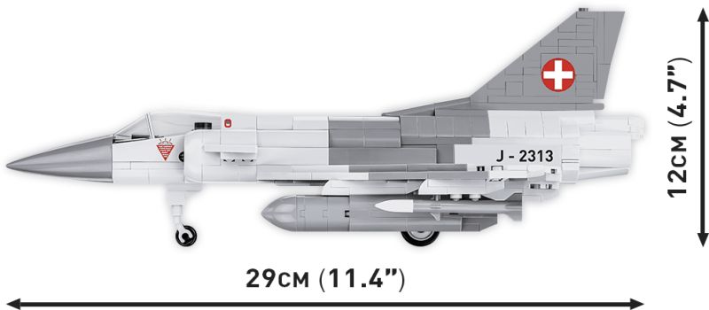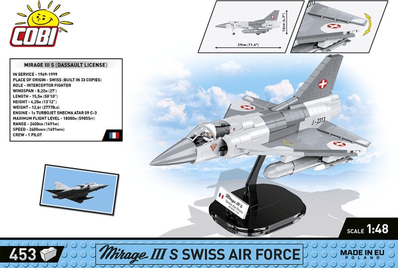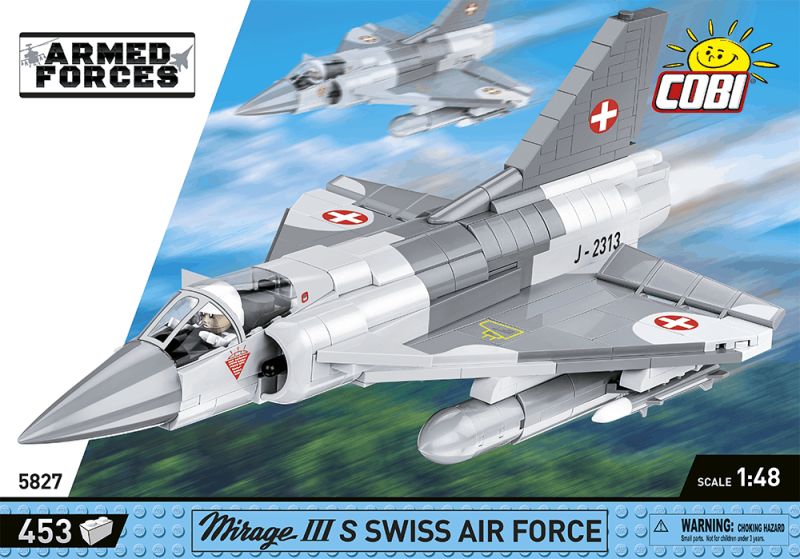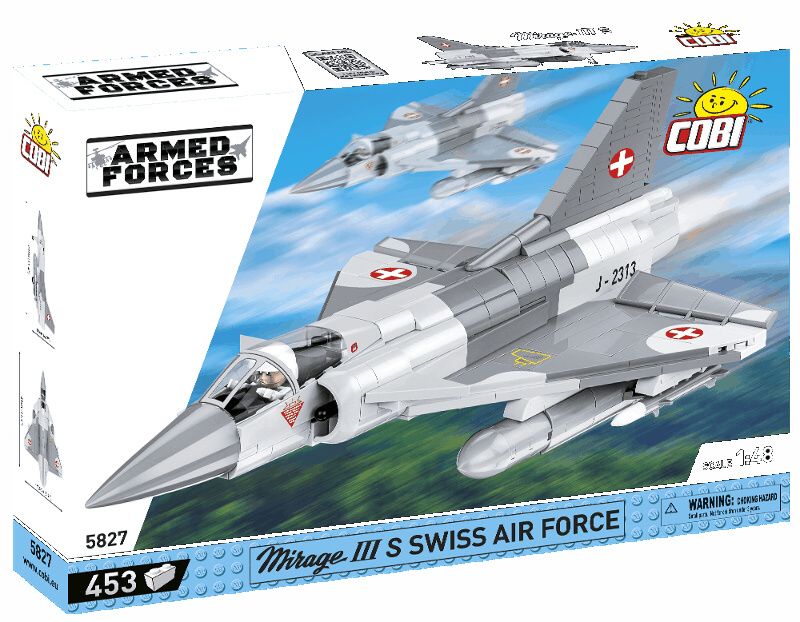 Stavebnica francúzskeho nadzvukového stíhacieho lietadla Mirage IIIS v kamufláži švajčiarskeho letectva. Model má nastaviteľné riadiace plochy a špeciálne upravenú figúrku pilota, ktorý sedí v kokpite. Pod krídlami sú zavesené dve rakety a prídavné nádrže. Zostavený model môže stáť na vlastnom podvozku alebo na stojane so štítkom, ktorý je súčasťou balenia. Či má pilot v kokpite slávnu švajčiarsku čokoládu, nevieme.
