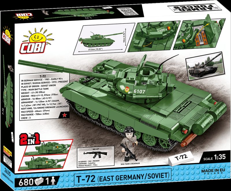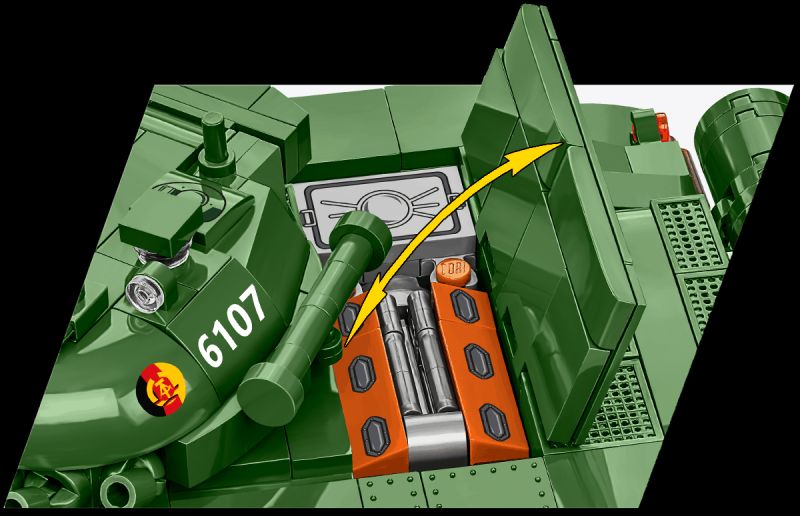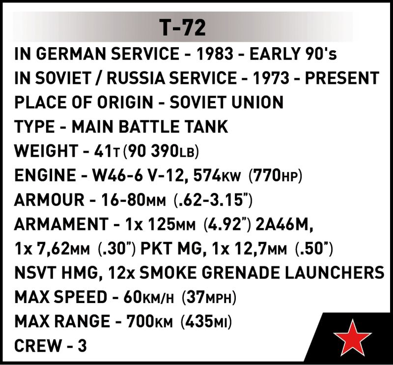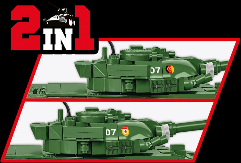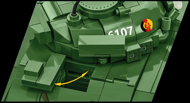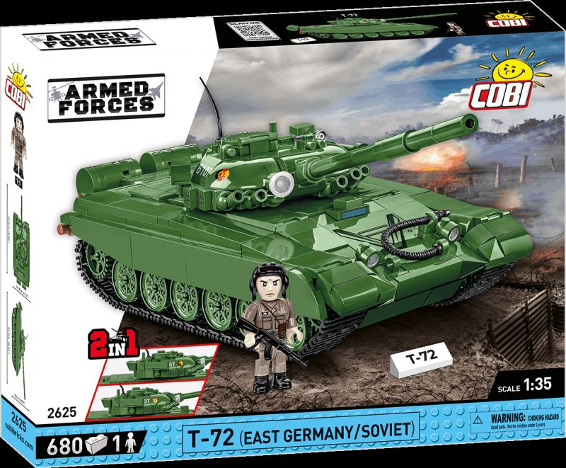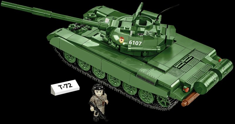 Stavebnica modelu stredného tanku T-72 v mierke 1:35. Zostavený model má otočnú vežu s nastaviteľným námerom kanónu, otváracie poklopy prielezov a otvárací kryt motora W46. Pásy tanku sú funkčné as modelom je možné rolovať po nekĺzavom povrchu. Stavebnica vo verzii 2v1 obsahuje kocky so znakmi tankovej armády východonemeckej demokratickej republiky a Sovietskeho zväzu. Súčasťou balenia je aj figúrka nemeckého tankistu ozbrojeného samopalom AK-47 a kocka s popisom.
