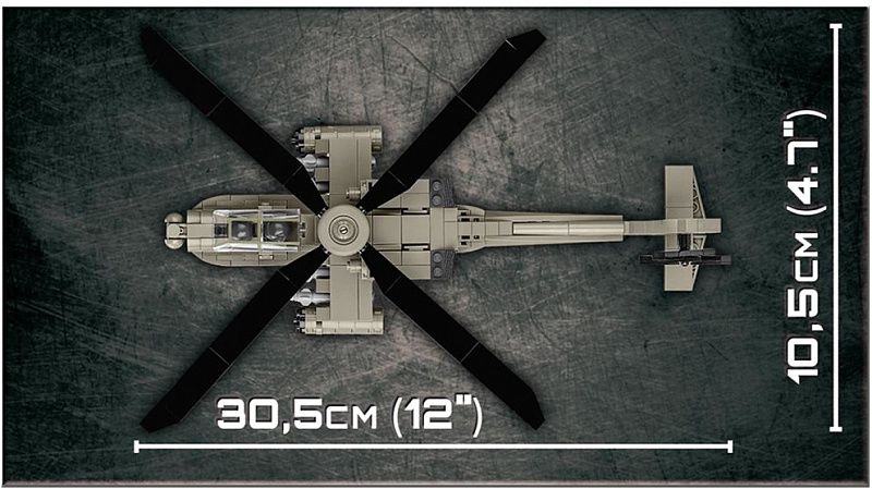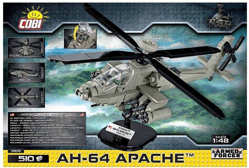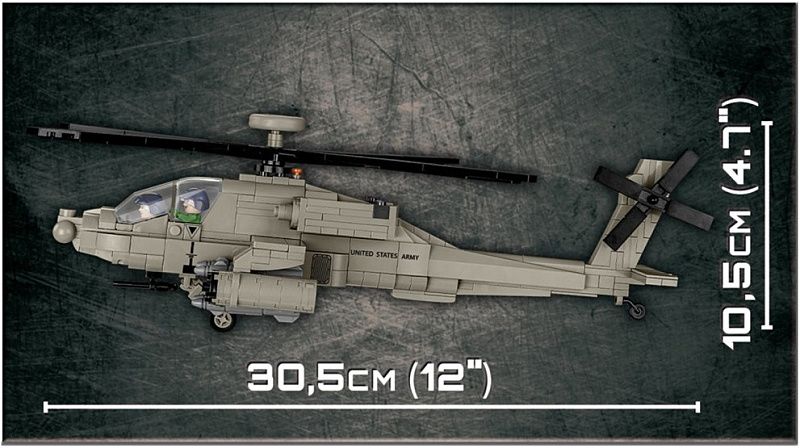 Stavebnica modelu amerického bojového vrtuľníka AH-64 Apache v mierke 1:48. Model má otočné rotory, otvárací kokpit a dve špeciálne upravené figúrky pilotov pre pohodlné usadenie do modelu. Vrtuľník môže stáť na vlastnom podvozku, alebo na priloženom stojane s popisom.