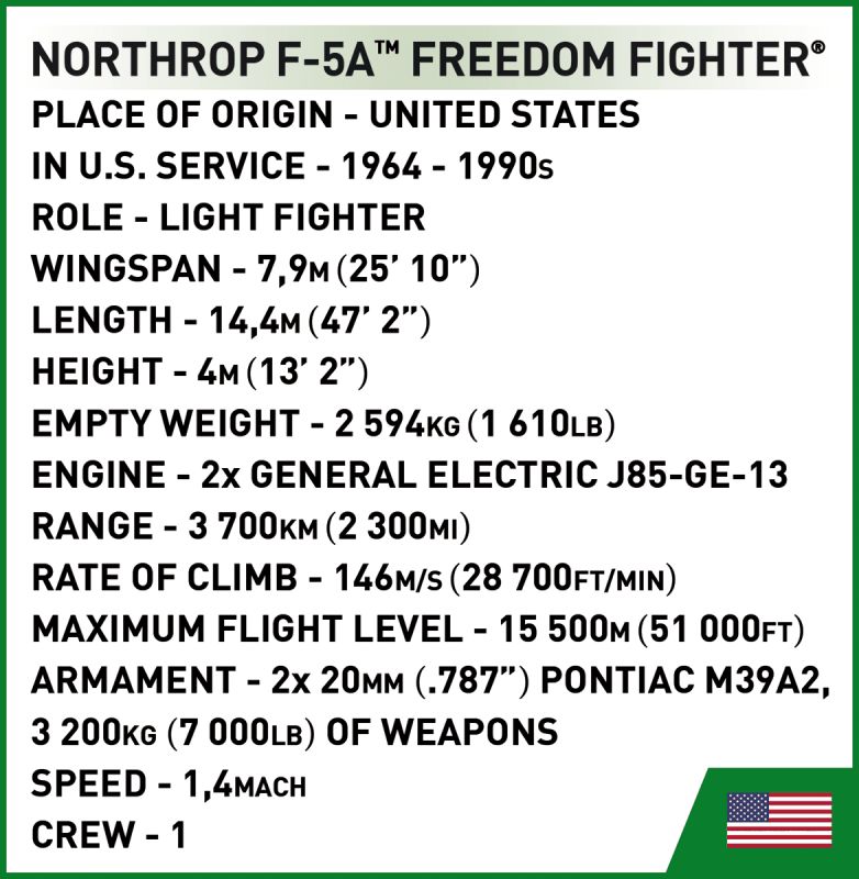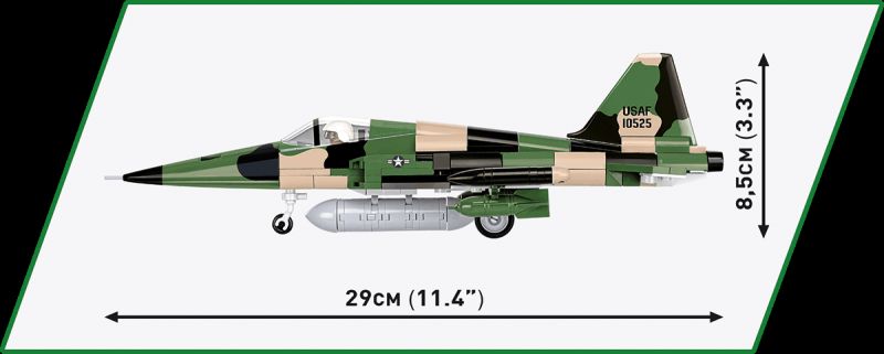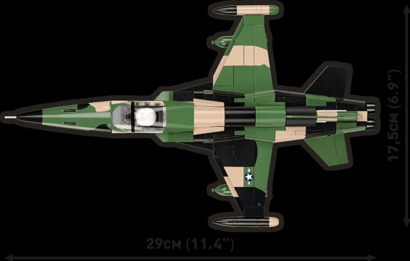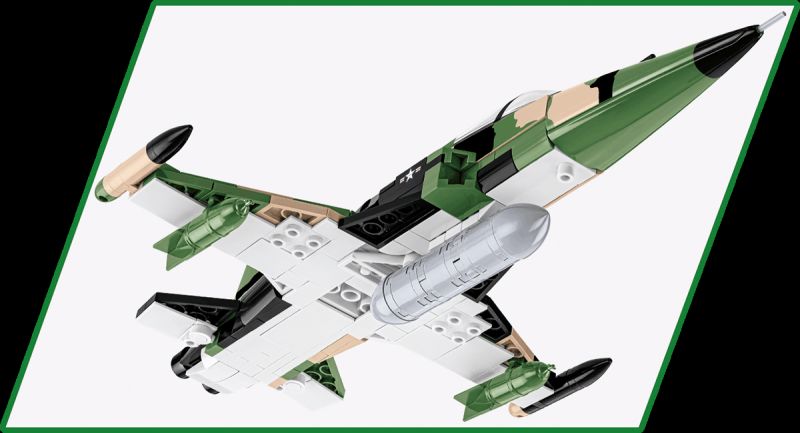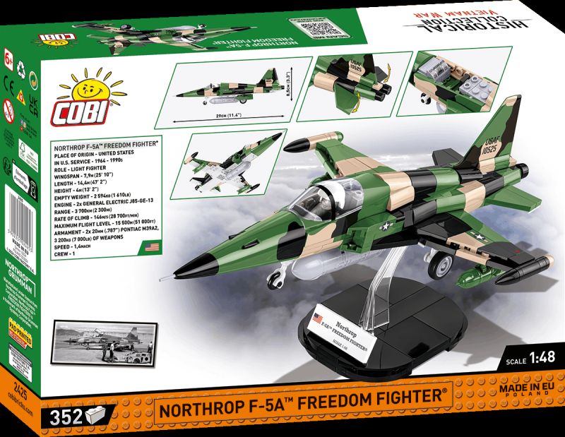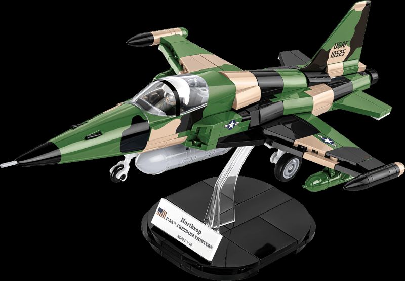 Stavebnica modelu amerického stíhacieho lietadla F-5A z obdobia vojny vo Vietname v kamufláži USAF. Model má nastaviteľné zadné riadiace plochy, odnímateľné podvozkové nohy a špeciálne upravenú figúrku na usadenie do kokpitu. Pod trupom je zavesená prídavná palivová nádrž. Zostavený model môže stáť na vlastnom podvozku, alebo na stojane s popisom, ktorý je súčasťou balenia. Stavebnice v mierke 1:48 prinášajú rovnakú radosť, ale viac miesta na poličke. Model je vyrobený pod oficiálnou licenciou spoločnosti Northrop Grumman.