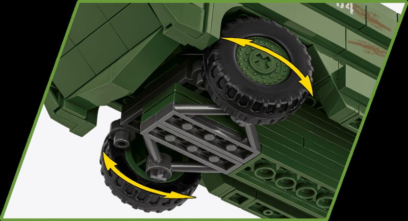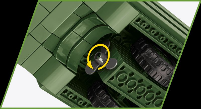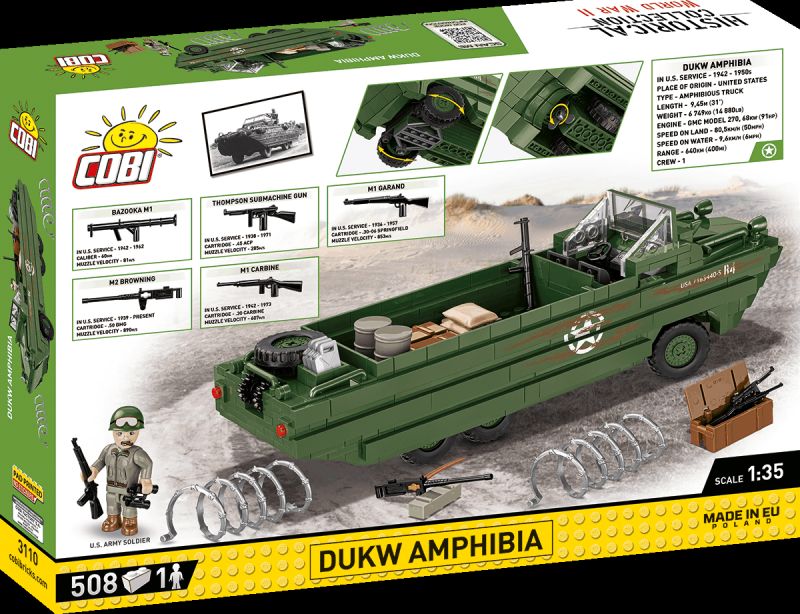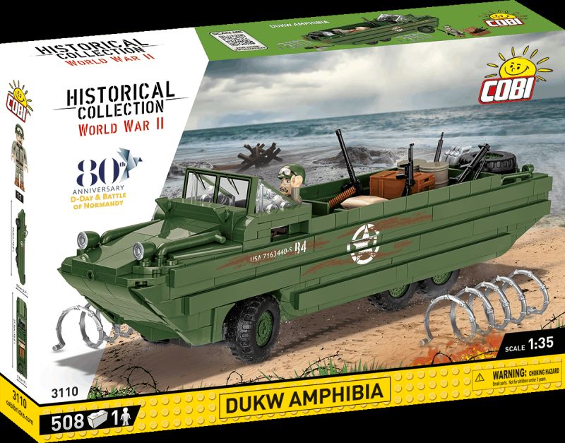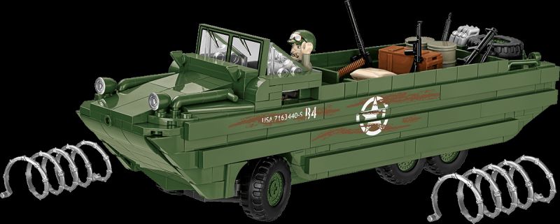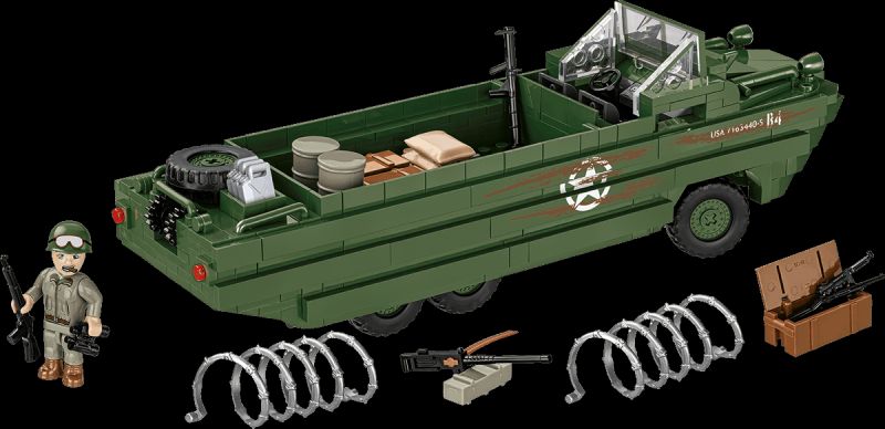 Stavebnica modelu vojenského obojživelného vozidla DUKW Amphibia GMC, ktoré sa zúčastnilo vyloďovacích operácií spojencov v Normandii. Zostavený model má otočnú lodnú skrutku, natáčacie kolesá prednej nápravy a navijak na zadnej časti vozidla. Súčasťou balenia sú barely a kanistre na palivo, rezervné koleso, vrecia s pieskom, muničná debna, žiletkové drôty a figúrka amerického vojaka vybaveného ďalekohľadom a sadou zbraní.