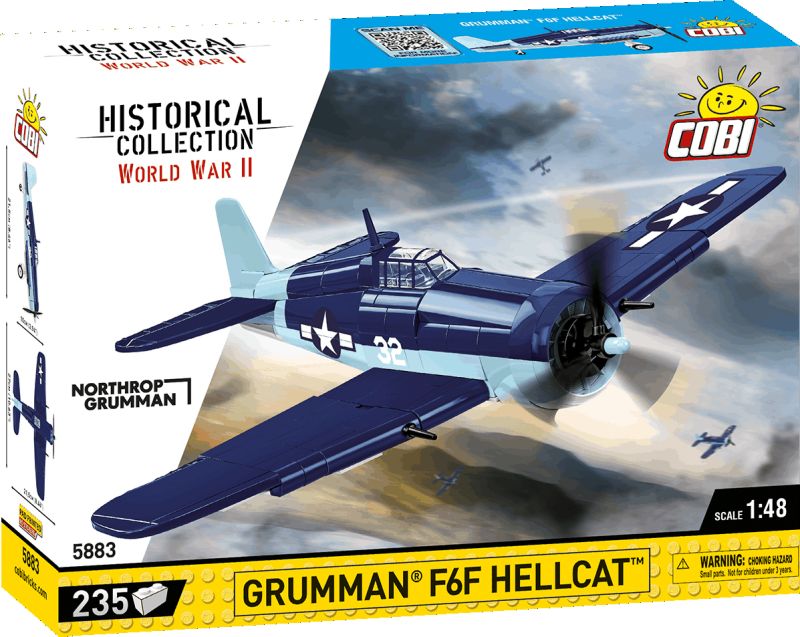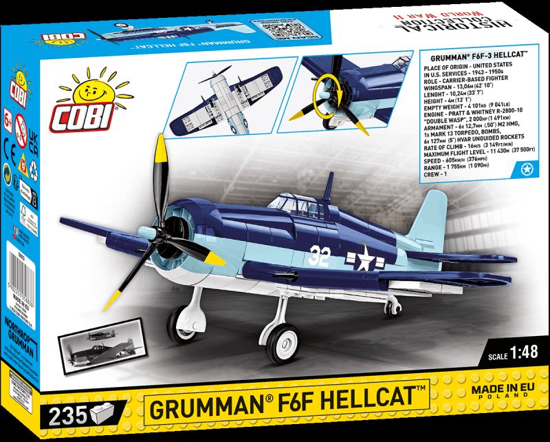Grumman F6F Hellcat bol legendárny americký palubný stíhač z obdobia druhej svetovej vojny, ktorý zohral kľúčovú úlohu v leteckých bitkách v Pacifiku. Navrhnutý ako odpoveď na japonské stíhačky Mitsubishi A6M Zero, vynikal robustnou konštrukciou, silnou výzbrojou a jednoduchým ovládaním. Práve tieto vlastnosti z neho spravili jeden z najefektívnejších strojov svojej doby – s pomerom víťazstiev k stratám až 19:1. COBI model v mierke 1:48 zachytáva tento ikonický lietadlový stíhač vo verzii námorného letectva USA s typickým dvojfarebným kamuflážnym náterom.