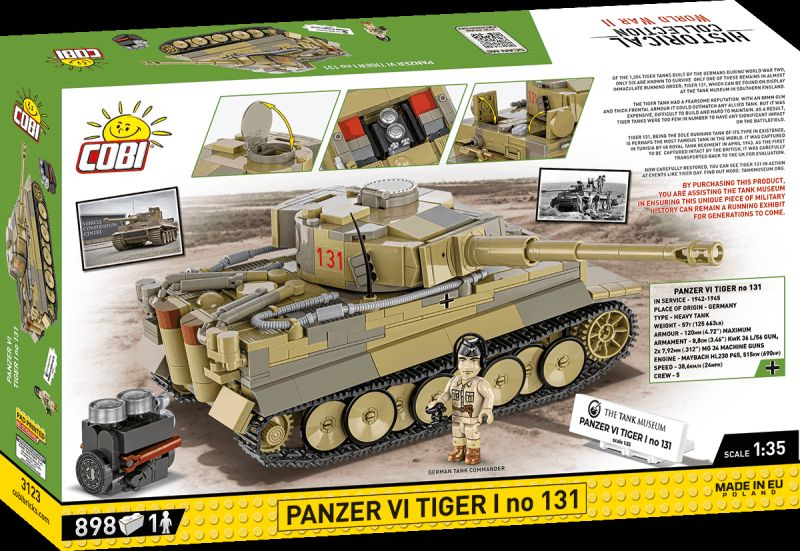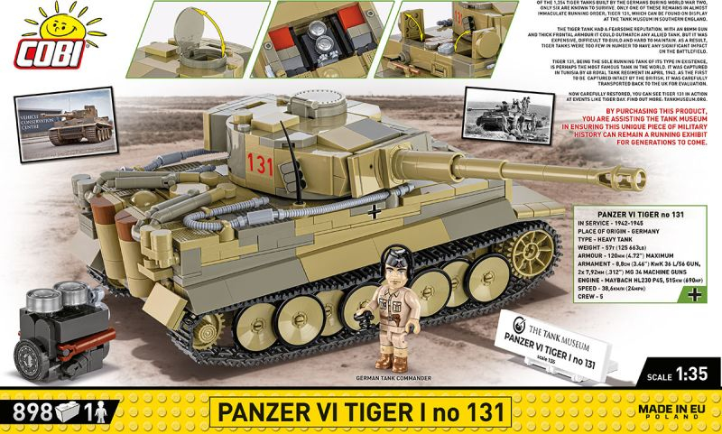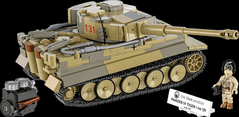 Stavebnica modelu legendárneho nemeckého tanku TIGER I "131", ktorý je v plne funkčnom stave uchovaný v Tankovom múzeu v Bovingtone. Model ponúka detailne spracovanú otočnú vežu s nastaviteľným námerom kanónu, otváracie poklopy prielezov a otvárací kryt motora. Motor Maybach je možné vybrať a vystaviť samostatne. Funkčné pásy umožňujú plynulý pohyb modelu po nekĺzavom povrchu. V balení nájdete aj figúrku veliteľa tanku a kocku s popisom.