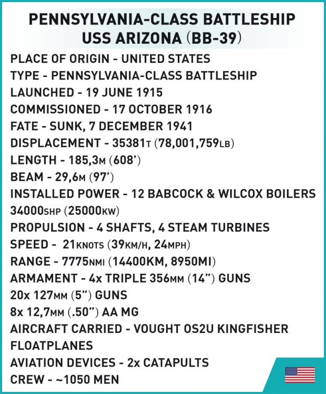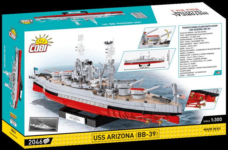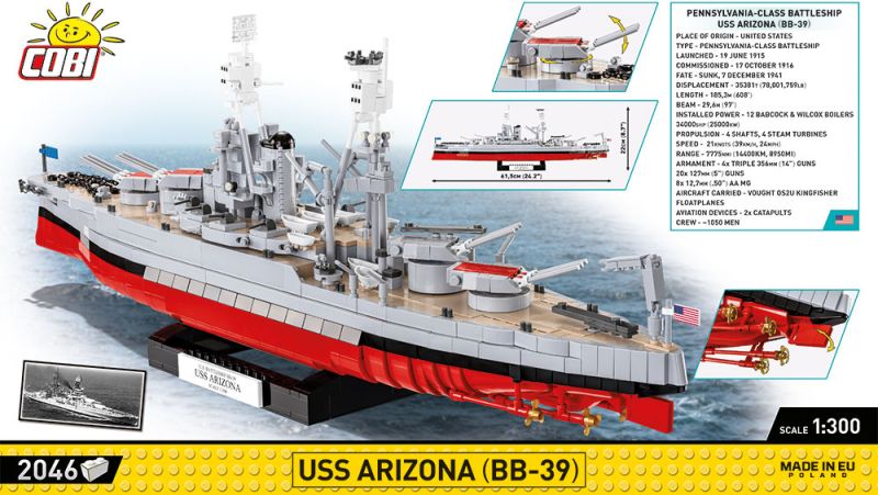 Stavebnica bojovej lode USS Arizona triedy Pennsylvania v mierke 1:300. Zostavený model má otočné vrtule, otočné delové veže s nastaviteľným zameriavaním, predné kotevné reťaze a zadný letecký katapult. Model možno pohodlne a bezpečne uložiť do stojana s popisom, ktorý je súčasťou balenia.