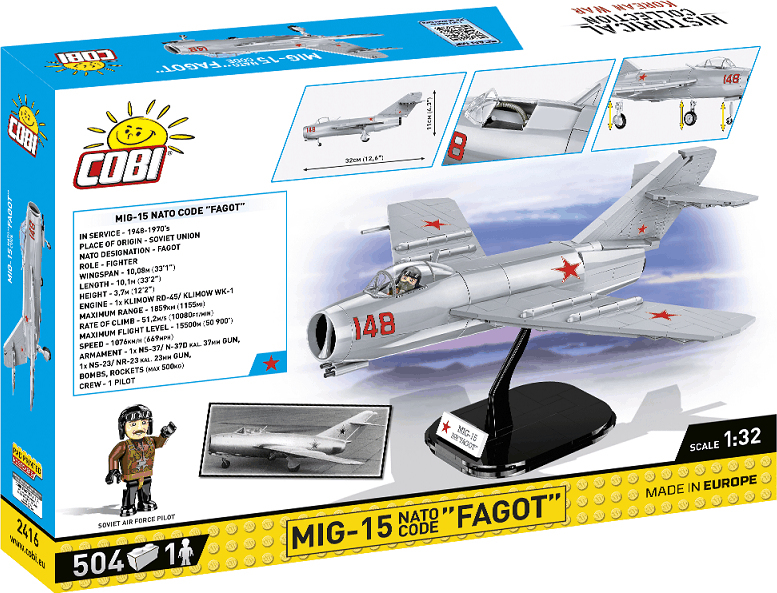 Stavebnica sovietskeho stíhacieho lietadla MIG-15 s kódovým označením NATO "Fagot". Zostavený model má odnímateľný kryt kokpitu na jednoduchú inštaláciu figúrky pilota. Model môže stáť na vlastnom podvozku alebo na priloženom stojane s popisom. Vzhľadom na konštrukciu modelu nie sú podvozkové nohy zasúvateľné, ale dajú sa ľahko odstrániť. Súčasťou je figúrka sovietskeho pilota s výstavnými fúzmi.