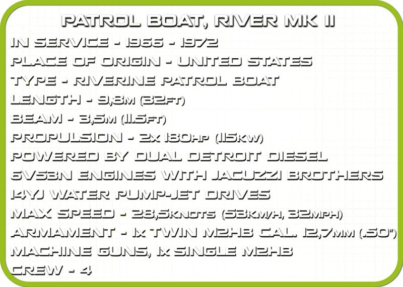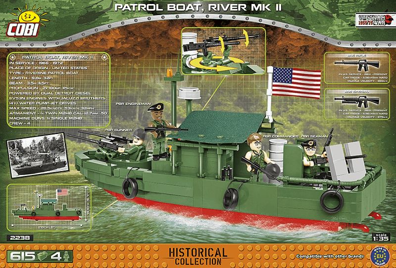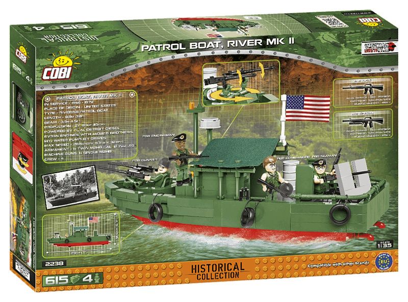 Na palube sa nachádza výzbroj v podobe blokových pušiek M2HB. Model obsahuje kompletnú posádku štyroch vojakov s príslušenstvom a osobnými zbraňami. Fanúšikovia tehál COBI si okrem látky určite všimnú aj ďalšiu novinku, ktorou je nový vzor vlajúcej vlajky! Po postavení má loďka dĺžku 28 cm. Je skvelým doplnkom zbierky VIETNAM WAR. Tehlový model hliadkovacieho člna si nevyžaduje lepenie ani maľovanie. Všetky grafické prvky a nápisy sú na tehličkách vytlačené vo forme veľmi odolných potlačí, ktoré sa pri vystavení slnečnému žiareniu, vode alebo dokonca veľmi intenzívnemu hraniu neopotrebujú ani nevyblednú. V modeli neboli použité žiadne nálepky. Sada určite prinesie veľa radosti najmladším fanúšikom tehličiek aj dospelým nadšencom histórie a námorného dizajnu. Model hliadkovacej lode bude určite vyzerať veľkolepo na zberateľskom stole, ako aj v izbe každého tínedžera a dieťaťa.