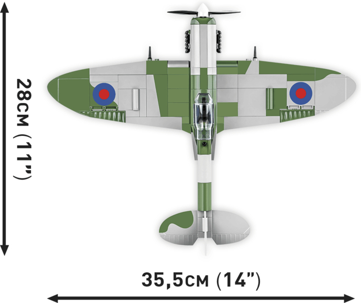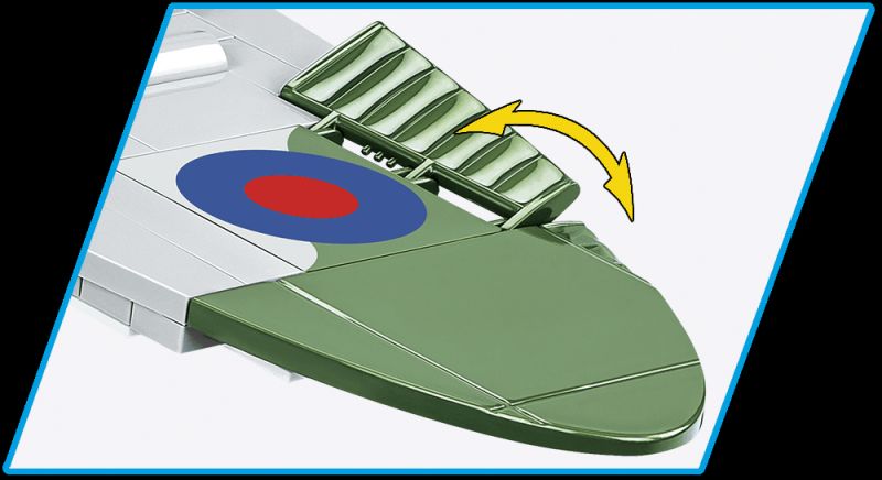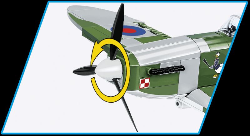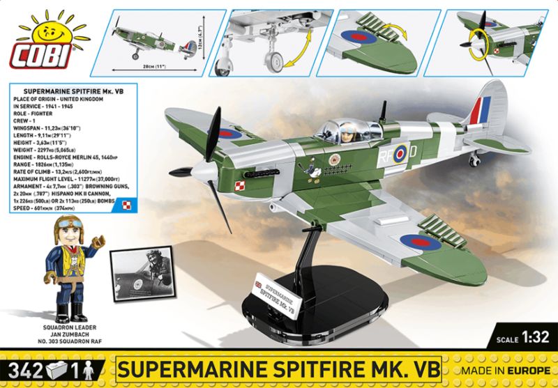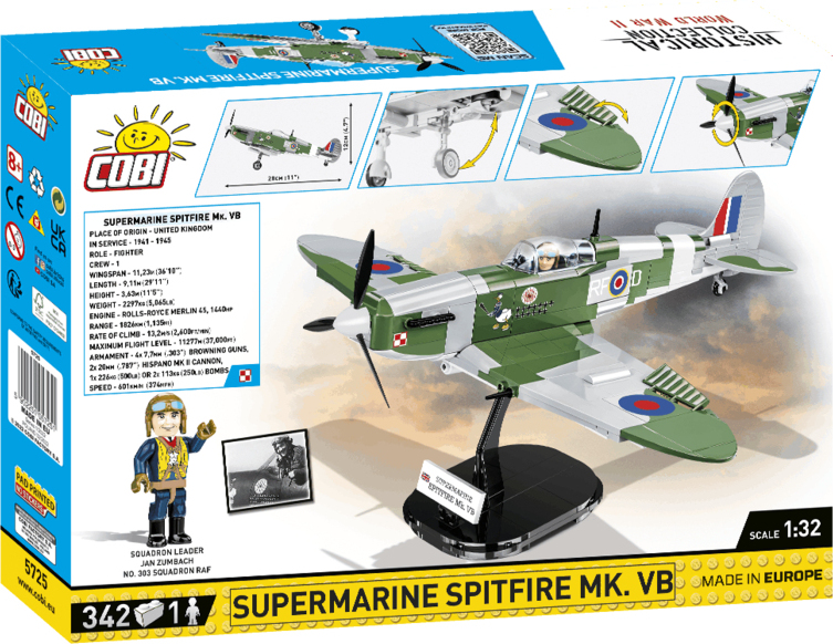 Stavebnica britského jednomiestneho stíhacieho lietadla Supermarine Spitfire MK.VB v zeleno-šedej kamufláži. Zostavené lietadlo má pohyblivé klapky, otočnú vrtuľu, zaťahovací podvozok a odnímateľný kryt kokpitu pre pohodlné sedenie postavy poľského veliteľa 303. letky RAF Jana Zumbacha. Lietadlo môže stáť na vlastnom podvozku alebo na stojane, ktorý je súčasťou balenia.