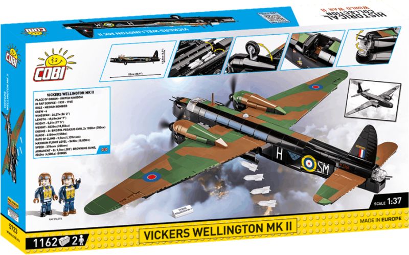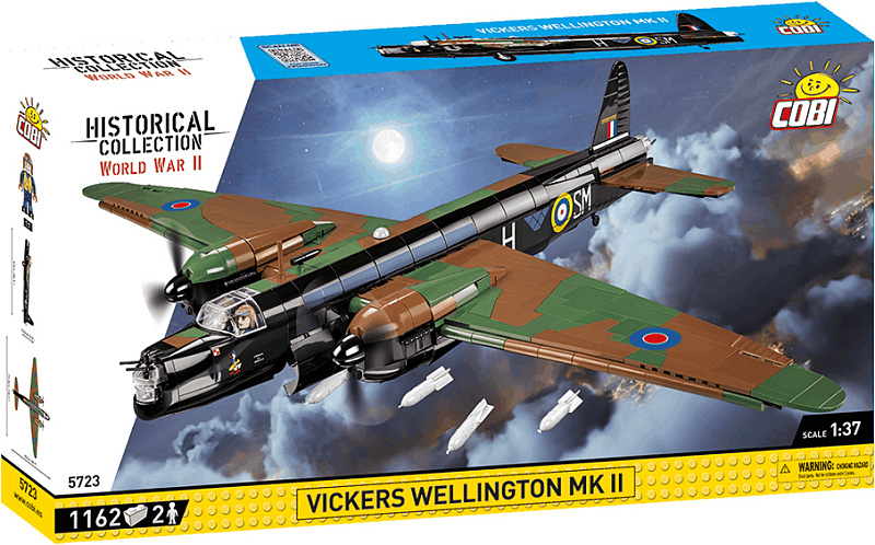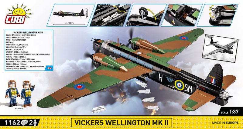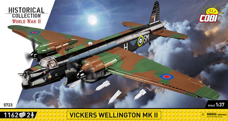 Stavebnica modelu britského dvojmotorového stredného bombardéra VICKERS WELLINGTON MK II v zeleno-hnedom maskovaní. Zostavený model má otváraciu pumovnicu, zaťahovací podvozok a otočný guľomet predného strelca. V kokpite je dosť miesta na usadenie oboch figúrok poľských pilotov v službách RAF. Na veľký model v mierke 1:37 bude potrebná veľká polička :-), pretože rozpätie krídiel zostaveného modelu je 71,5 cm.