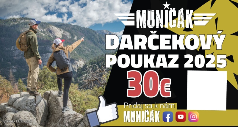 Darčekový poukaz v hodnote 30€ určite vyrieši vašu dilemu čo kúpiť vášmu otcovi, bratovi či frajerke. V Muničáku si vyberie každý to čo sa mu páči. Či už je milovníkom prírody, military, airsoftu alebo hľadá štýlové a kvalitné oblečenie značiek ako sú Alpha Industries, určite ho táto poukážka poteší.