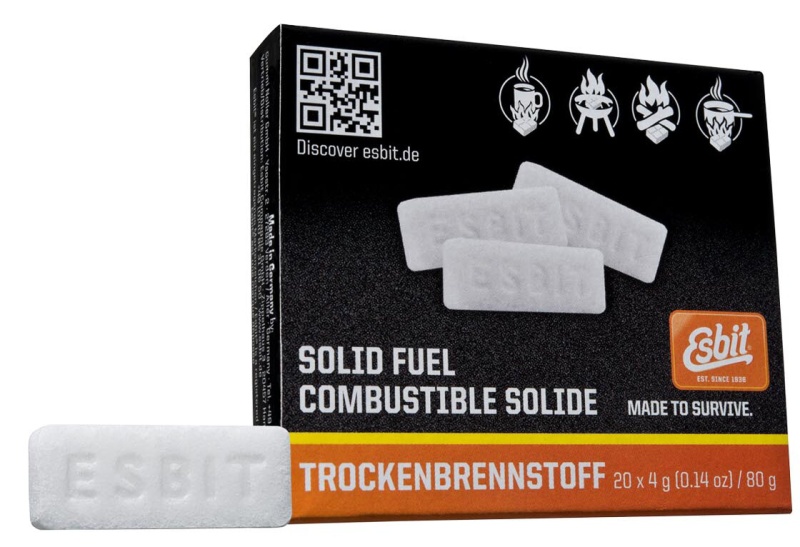 Esbit je svetová jednotka vo výrobe tuhých palív. Tablety pevného liehu od Esbit sú spoľahlivým zdrojom ohňa, ktorý sa zmestí do každého batohu. Sú ideálne na varenie, ohrievanie jedál a nápojov, ale aj na zakladanie ohňa či zapálenie dreveného uhlia v grile. Palivo funguje aj vo vysokých nadmorských výškach a teplotách pod bodom mrazu.