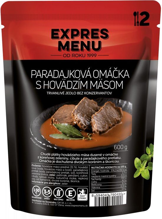 Zloženie: hovädzie mäso predné (31 %), hovädzí vývar (voda, hovädzie mäso a kosti), paradajkový pretlak (voda, paradajkový pretlak, soľ), koreňová zelenina (mrkva, zeler, paštrnák, petržlen), cukor, cibuľa, ryžová múka, kukuričná múka, repkový olej, soľ kamenná, divoké korenie, škorica.