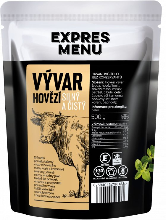 Zloženie: hovädzí vývar (voda, hovädzie kosti, hovädzie mäso, mrkva, petržlen, cibuľa, zeler, cesnak, soľ kamenná, bobkový list, nové korenie, čierne korenie celý).
