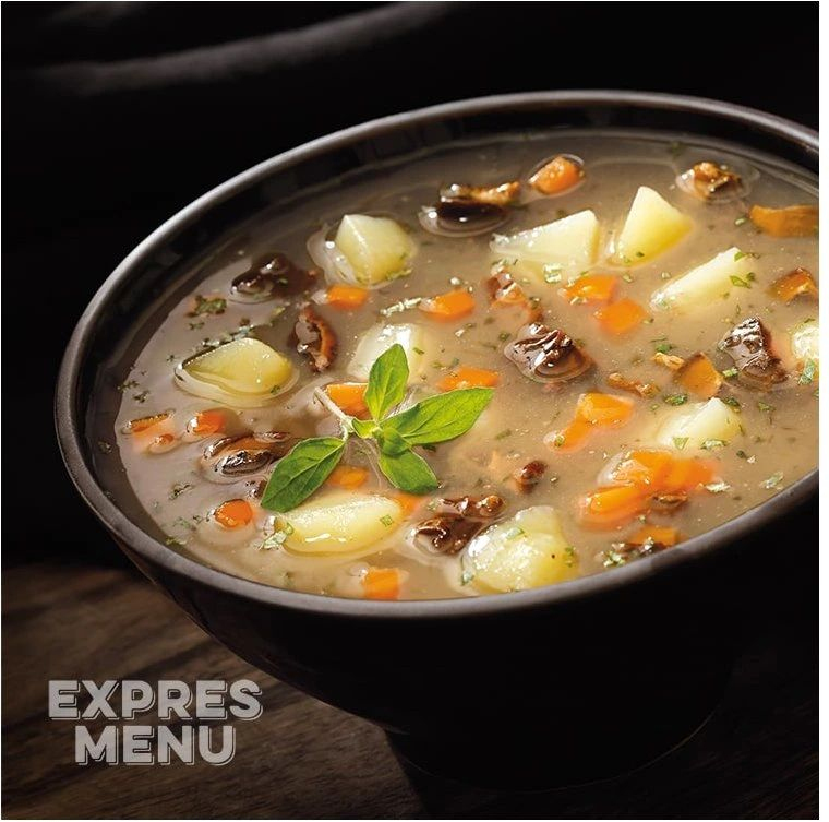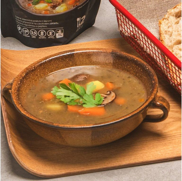 Výdatná zeleninová polievka pripravená na cibuľovom základe, dochutená majoránom, čiernym korením a obohatená o aromatické lesné huby. Skvelá voľba na desiatu aj ľahší obed – vhodná aj pre deti, vegetariánov a vegánov.