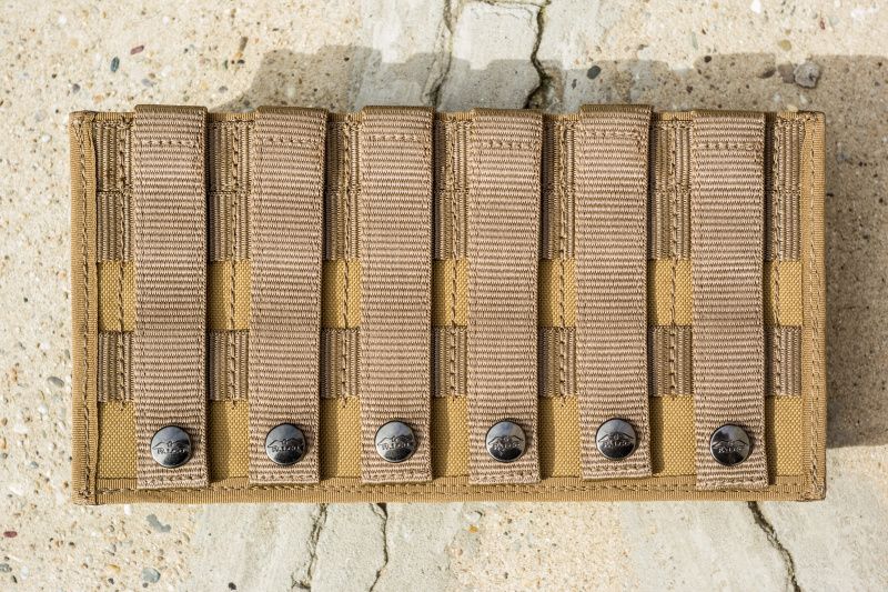 Vyrobené z odolného plastového korpusu potiahnutého látkou v odtieni coyote pre lepšie maskovanie a tichšiu manipuláciu. Uchytenie je riešené pomocou MOLLE systému, ktorý zaručuje kompatibilitu s taktickými vestami, nosičmi plátov alebo opaskami s MOLLE väzbou.