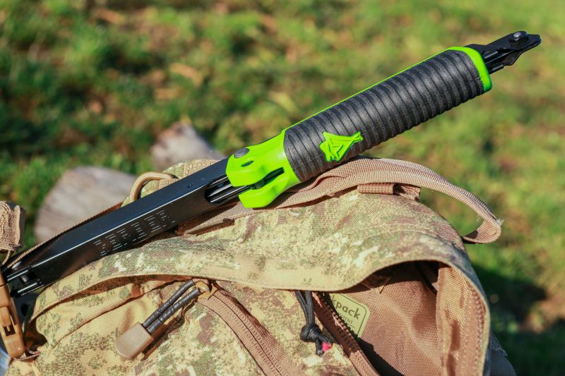 Gerber FREESCAPE CAMP je oblúková píla, ktorú viete jednoducho zložiť do puzdra a vložiť do batohu. Štyri otočné body slúžia na jednoduché zloženie a rozloženie pílky. Priľnavá gumová rukoväť s textúrou zabezpečuje ešte lepší úchop. Výrazná jasne zelená časť rukoväte vám pomôže ľahko nájsť pílku aj po tme.