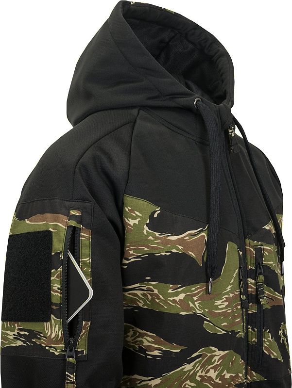 Rogue Hoodie je jedinečná mestská taktická mikina, ktorá spája vojenský štýl s modernými technickými riešeniami. Vyrobená je z odolného polyesteru s použitím technológie rip-stop, vďaka čomu je odolná voči oderu a roztrhnutiu, čo zaručuje dlhú životnosť v rôznych podmienkach. Voľný strih a nastaviteľná kapucňa na šnúrku poskytujú pohodlie a ochranu pred chladom a vetrom. Unikátne panely s maskovacím vzorom dodávajú mikine výrazný vojenský vzhľad.