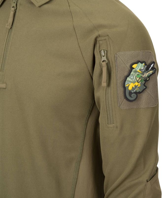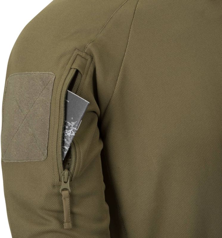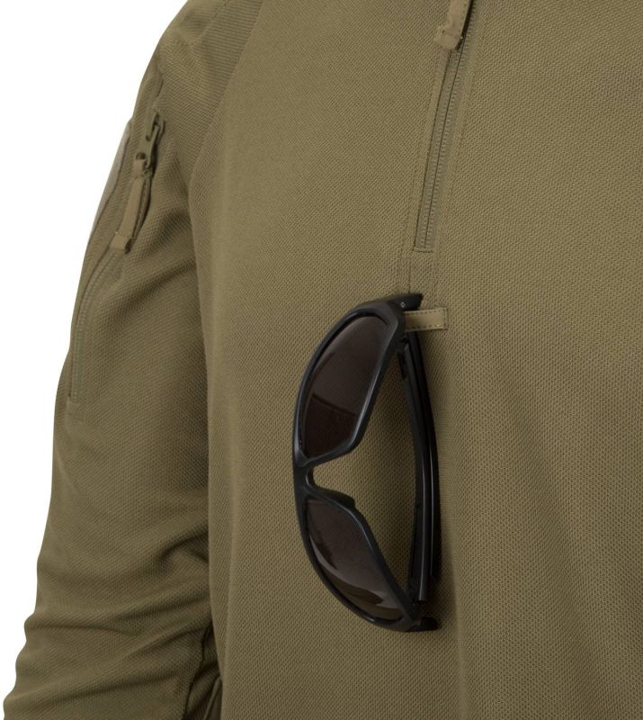 Na ramenách nájdete vrecká so zapínaním na zips s našitými velcro panelmi kde si môžete prichytiť vaše nášivky. Zo spodnej strany rukávov je umiestnená sieťovaná časť pre lepšie vetranie. Vystužený golier sa zapína taktiež na zips čo uľahčuje obliekanie trička. Všetky použité zipsy sú od YKK®. Pod zipsom goliera nájdete taktiež pútko na uchytenie okuliarov. Pohodlnosť trička posilňujú aj úpletové zakončenia rukávov.