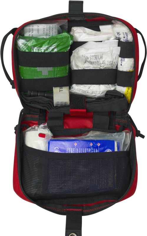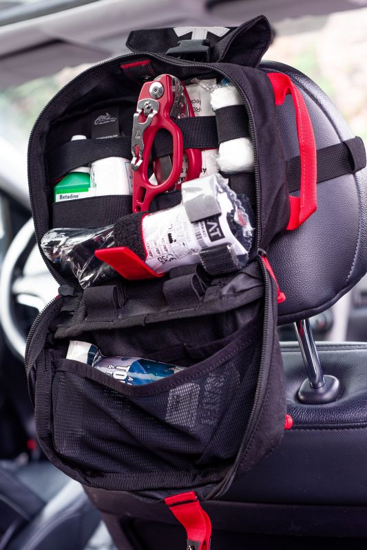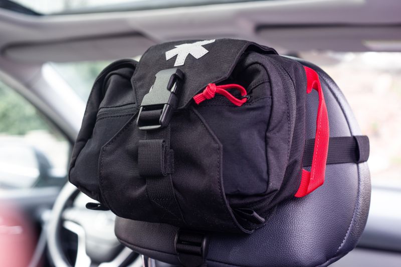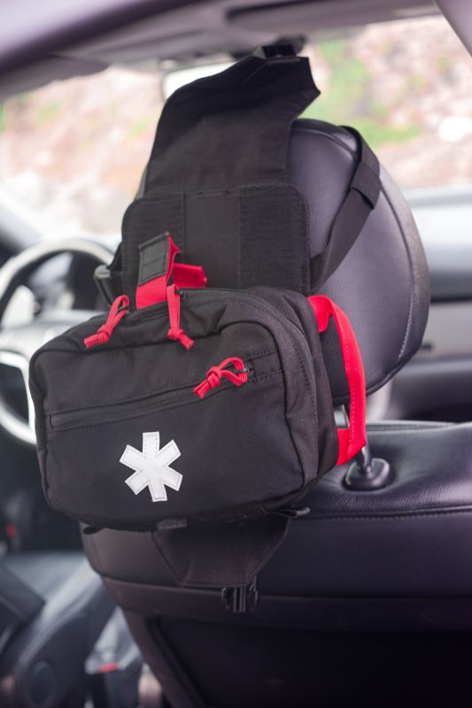 Rýchly prístup k lekárničke môže byť nevyhnutný pre prežitie. Lekárničku do vozidla možno pripevniť na zadnú stranu opierky hlavy sedadla a v prípade potreby ju použiť jedným prudkým pohybom. Pre ľahký prístup má lekárnička úchyty v kontrastnej farbe na oboch stranách. Z vonkajšej strany má lekárnička Vehicle Med Kit ploché vrecko na zips na rukavice, bezpečnostnú vestu atď. Hlavné vrecko sa rozopína, takže lekárničku možno zložiť na plocho. Vo vnútri sa nachádzajú nárazové šnúry, vrecká a rukoväte, takže môžete voľne pripevniť vybavenie lekárničky.