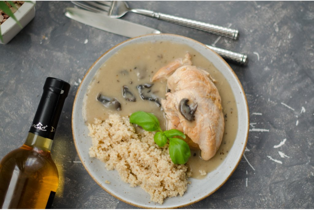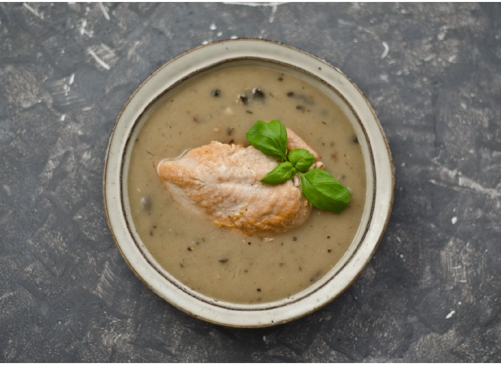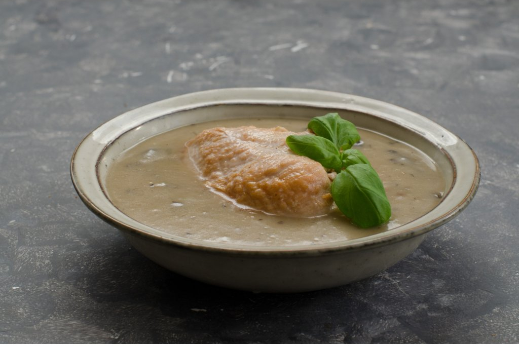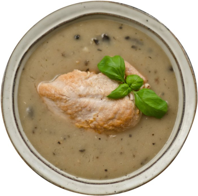 Zloženie: Kuracie prsné rezne, šampiňóny, cibuľa, repkový olej, PŠENIČNÁ MÚKA, soľ, rasca, voda