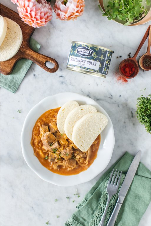 Zloženie: Bravčové mäso stehno (SK) 30 %, pitná voda, kyslá kapusta 14,1 %, cibuľa, SMOTANA na varenie 12 %, PŠENIČNÁ MÚKA, údená bravčová slanina (SK), bravčová masť, cukor, cesnak, MASLO, jedlá sol, paprika červená mletá, hovädzí bujón, rasca, čierne korenie.