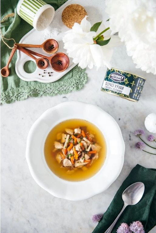 Zloženie: Pitná voda, sliepka 25,8 %, Kuracie rezne 15,2 %, Zmes zeleniny 11,4 % (mrkva, zeler, petržlen), Cibuľa, Soľ jedlá, Slepačí bujón, Petržlenová vňať sušená, ,Čierne korenie, Nové korenie, Cesnak sušený, Bobkový list
