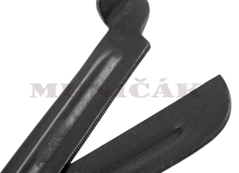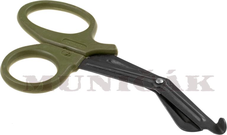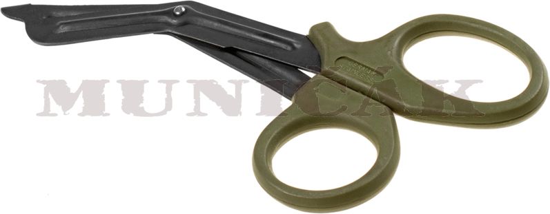 Zahnuté zdravotnícke nožnice s tupými hrotmi a plastovou rukoväťou.