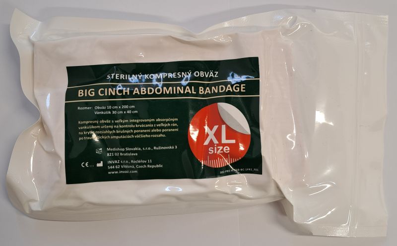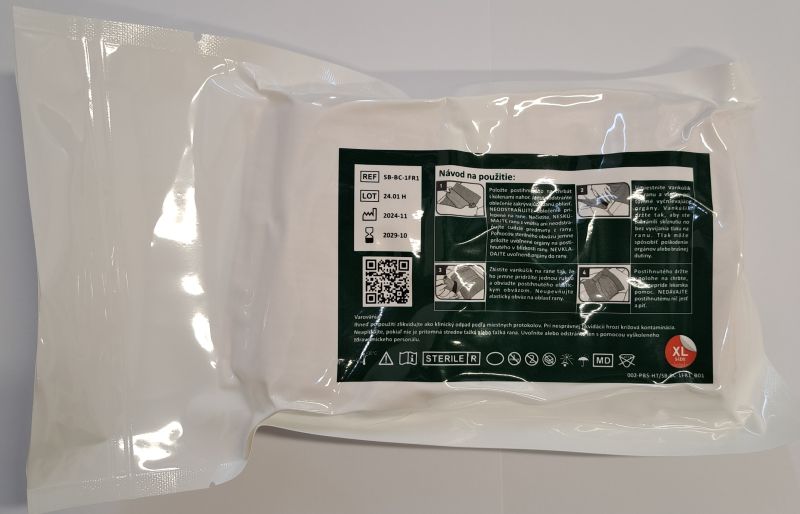 Sterilný tlakový obväz s integrovaným savým vankúšikom je určený na kontrolu silného krvácania z rozsiahlych rán, ako aj na krytie veľkých poranení brucha či traumatických amputácií.
