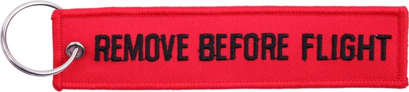 Kľúčenka s krúžkom a nápisom “REMOVE BEFORE FLIGHT”.