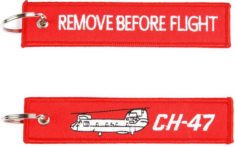 Kľúčenka s krúžkom a nápisom REMOVE BEFORE FLIGHT na jednej strane. Na druhej strane je zobrazený CH-47.