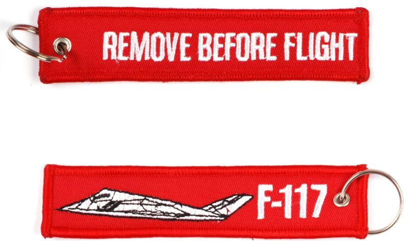 Kľúčenka s krúžkom a nápisom REMOVE BEFORE FLIGHT na jednej strane. Na druhej strane je zobrazená F-117.