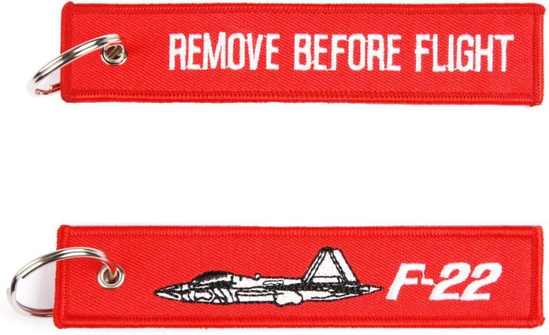 Kľúčenka s krúžkom a nápisom REMOVE BEFORE FLIGHT na jednej strane. Na druhej strane je zobrazený F-22.