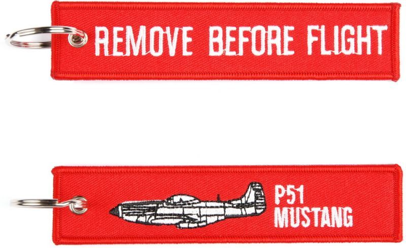 Kľúčenka s krúžkom a nápisom REMOVE BEFORE FLIGHT na jednej strane. Na druhej strane je zobrazený P-51 Mustang.