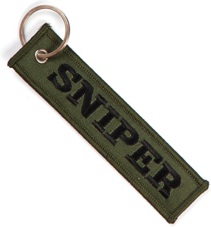 Tmavozelená nylonová kľúčenka zelenej farby s čiernym nápisom SNIPER.