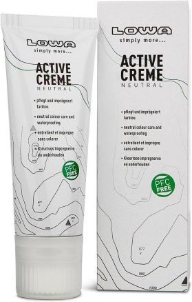 LOWA Active creme je pastovitý prípravok na ošetrenie obuvi s koženým zvrškom. Lowa Active Creme je pastovitý prípravok na ošetrenie obuvi s koženým zvrškom a textilnej membránovej (GTX) obuvi, zaisťujúci vodoodpudivosť pri zachovaní plnej priedušnosti membrány. Prípravok je bezfarebný, ale mierne stmavuje ošetrovanú useň. Zachováva pri nubuku aj semišu pôvodný matný vzhľad. Vďaka fluorokarbonovému základu je potrebné ho používať minimálne raz za 2 týždne užívania obuvi a vždy po každom sušení mokrej obuvi.