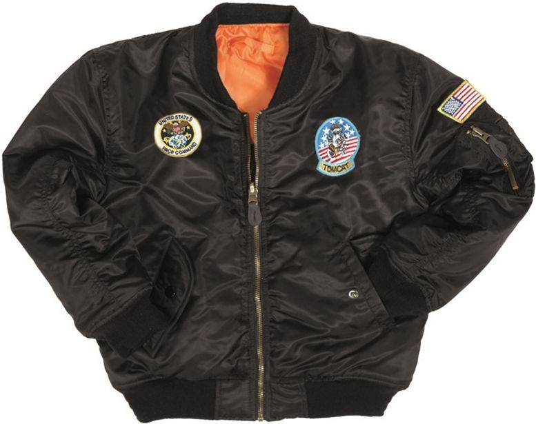 Detská letecká bunda US MA1 známa aj pod názvom “bombera” je vetruodolná a čiastočne nepremokavá. Bunda má zapínanie na veľký kovový zips, dve vrecká pre ruky kryté klopou na cvok, dve vnútorné vrecká, na ľavom rukáve vrecko so zipsom, golier spolu s rukávmi a pásom z pružného úpletu, našité nášivky.