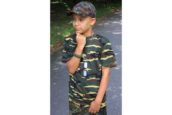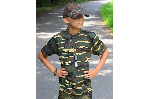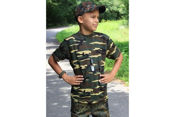 Kvalitné maskáčové detské tričko s krátkym rukávom a kruhovým výstrihom. Tričko má dvojité šitie na rukávoch a dolnom leme a elastický vrúbkovaný límec.