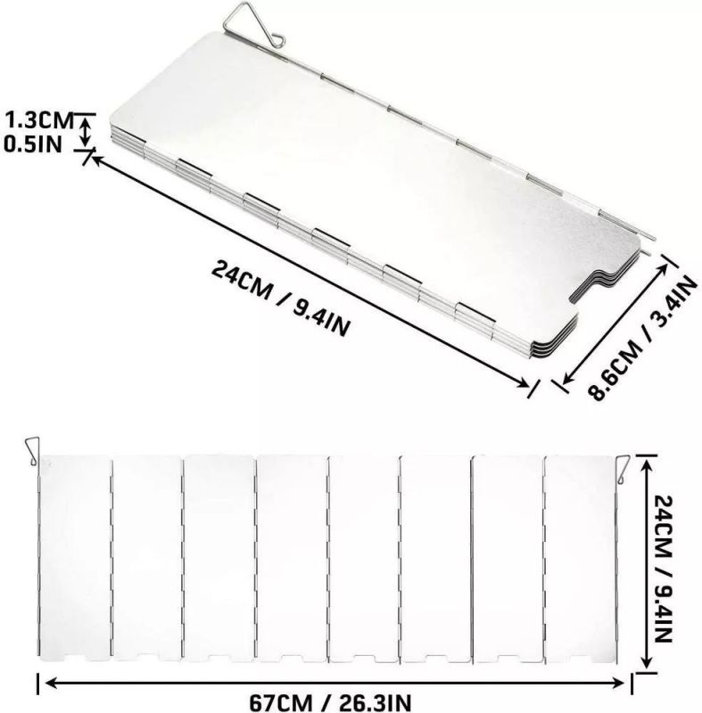 MILTEC Závetrie pre variče 67x24cm, hliníkové je praktický a skladací ochranný prvok pre plynové alebo liehové variče. Vyrobený z ľahkého hliníka, závetrie zlepšuje efektívnosť varenia tým, že chráni plameň pred vetrom a zabraňuje úniku tepla, čo umožňuje rýchlejší ohrev jedál a úsporu paliva.