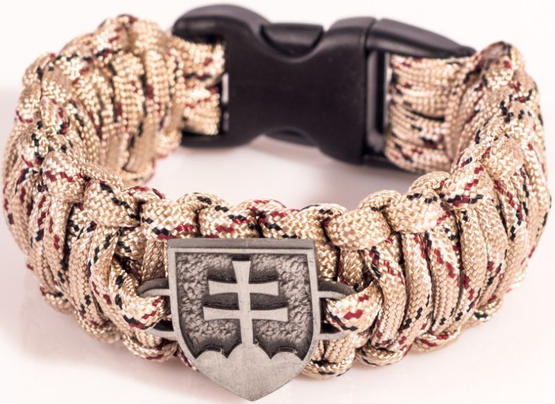 Náramok z paracord šnúry s SK znakom, ktorý slúži najmä pre pocit príslušnosti, ale v núdzi sa dá rozmotať a získa sa tým paracord, použiteľný pre rôzne núdzové situácie.