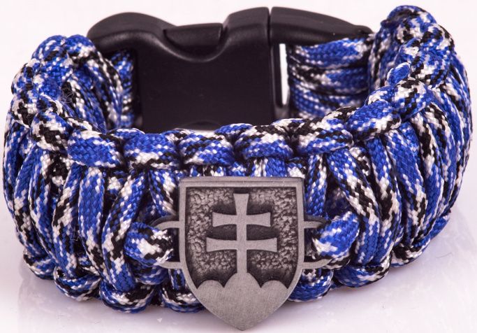 Náramok z paracord šnúry s SK znakom, ktorý slúži najmä pre pocit príslušnosti, ale v núdzi sa dá rozmotať a získa sa tým paracord, použiteľný pre rôzne núdzové situácie.