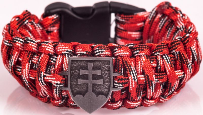 Náramok z paracord šnúry s SK znakom, ktorý slúži najmä pre pocit príslušnosti, ale v núdzi sa dá rozmotať a získa sa tým paracord, použiteľný pre rôzne núdzové situácie.
