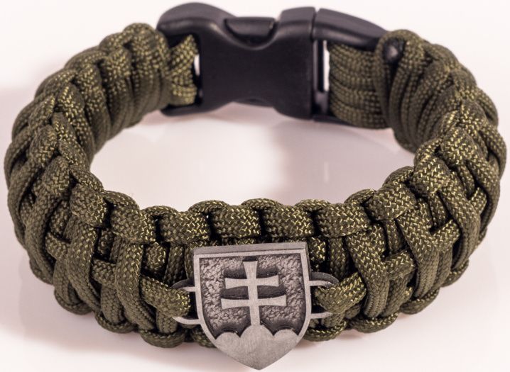 Náramok z paracord šnúry s SK znakom, ktorý slúži najmä pre pocit príslušnosti, ale v núdzi sa dá rozmotať a získa sa tým paracord, použiteľný pre rôzne núdzové situácie.